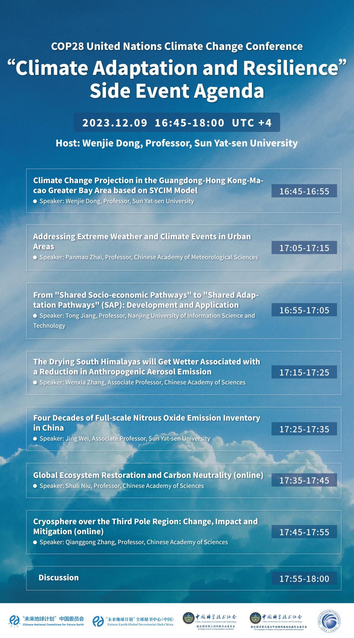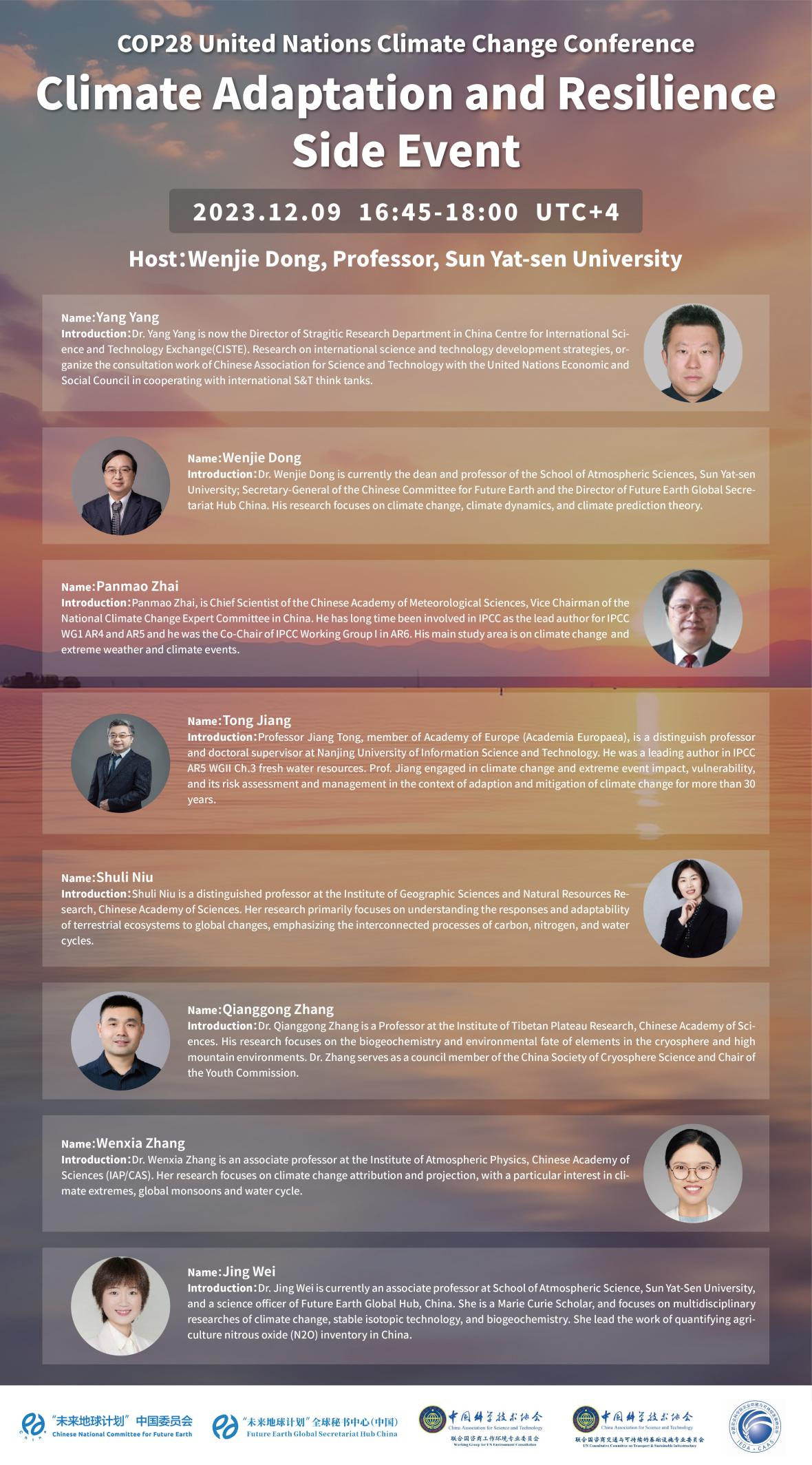 中国科协联合国咨商环境专委会秘书长、中山大学大气科学学院院长董文杰教授,中国气象科学研究院首席科学家、国家气候变化专家委员会副主任翟盘茂研究员,欧洲科学院院士、南京信息工程大学姜彤教授,中科院地理所牛书丽研究员,中科院青藏高原所张强弓研究员,中科院大气所张文霞副研究员,中山大学魏静副教授等专家将出席并做主题发言,共同围绕气候适应和韧性的边会议题进行讨论,其中包括极端气候事件和灾害风险指标、气候临界点、区域响应和气候变化适应、气候金融和可持续发展目标、能源转型和基于自然的解决方案等。此外,会议还将探讨气候变化对社会、经济和政治发展的影响。