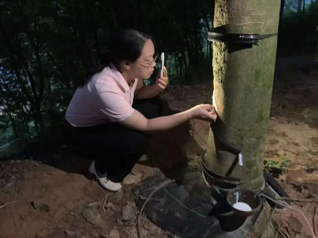 “胶工们半夜两三点就要摸黑上山割胶,环境差、报酬低,年轻人都不愿干。”谢黎黎明白割胶工作的辛苦。多次走访各地调研后,她亲眼看到了胶工队伍难以稳定的情况,意识到必须从技术层面寻找突破,一个想法悄然而生:能否通过降低割胶频率,让胶工在同一时间内管理更多橡胶树,从而提高收入?