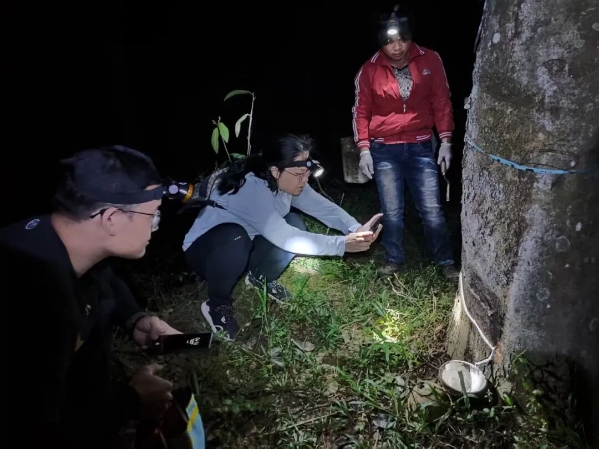 凌晨,谢黎黎在胶园调查橡胶树排胶情况