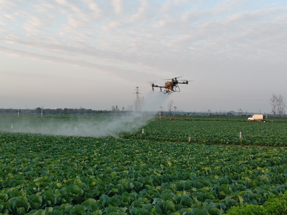 无人机在甘蓝基地进行施肥作业。