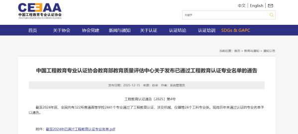 12月15日,中国工程教育专业认证协会发布《中国工程教育专业认证协会 教育部教育质量评估中心关于发布已通过工程教育认证专业名单的通告》