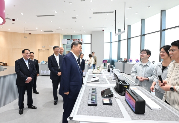 2025年4月29日,中共中央总书记、国家主席、中央军委主席习近平在上海考察。这是习近平总书记在位于徐汇区的上海“模速空间”大模型创新生态社区人工智能产品体验店考察。新华社记者 谢环驰 摄