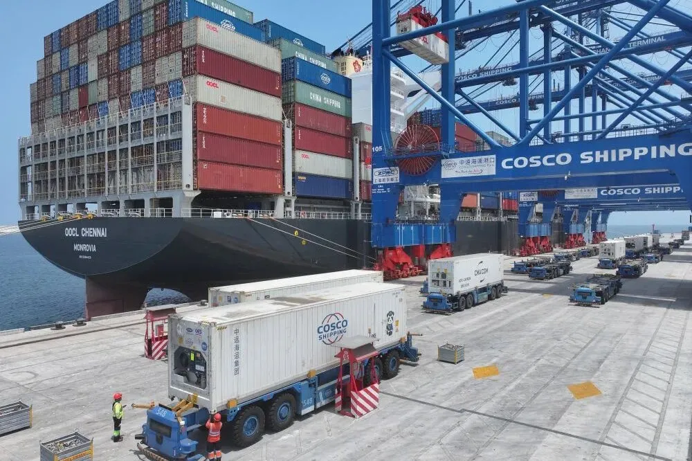 △2025年10月4日,在秘鲁钱凯港,智能集卡装载到港集装箱。新华社发 伊万·帕斯 摄