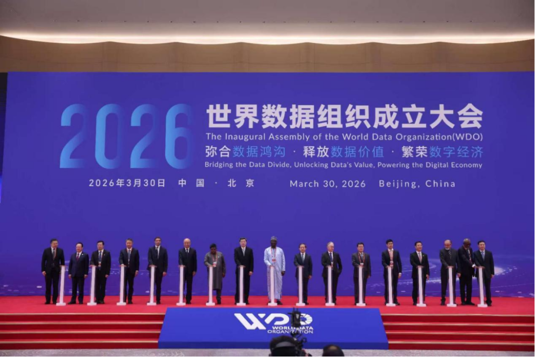 2026年3月30日,北京,世界数据组织成立大会现场。穆科德(居中)同与会代表共同见证组织正式运行
