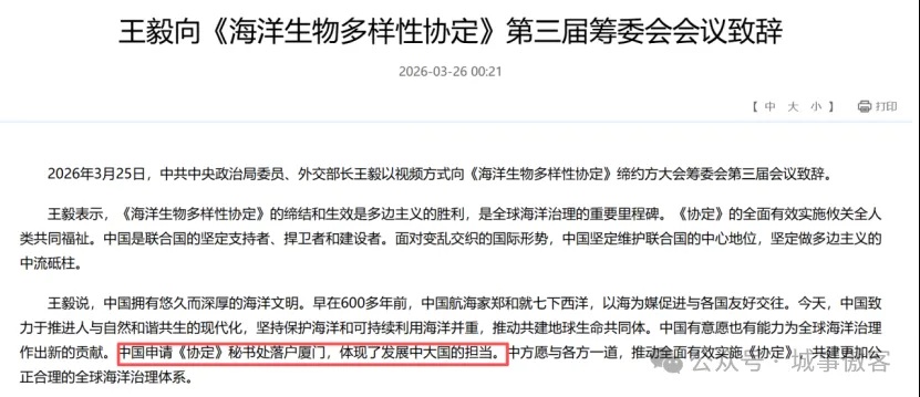 中国外交部长王毅视频致辞定调:厦门申办 BBNJ 秘书处,体现了发展中大国的担当。
