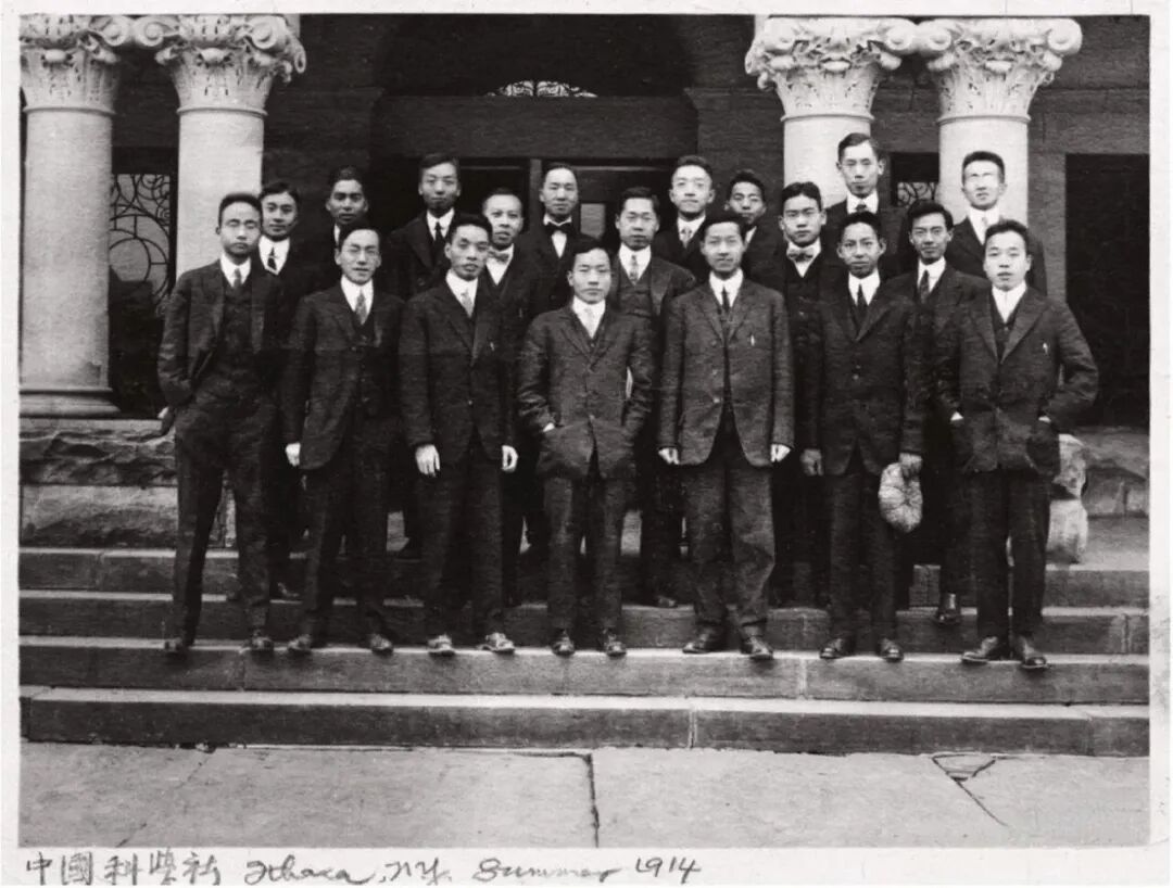 1914年科学社社员合影 前排:左2周仁,左3任鸿隽,左5赵元任,左6杨杏佛;中排:左2秉志,左3胡明复,左4金邦正;后排:左2过探先。