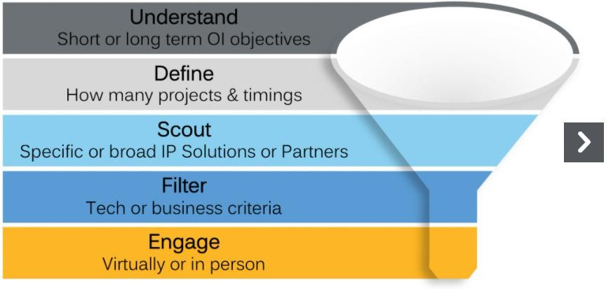 Yet2 的执行方法可能因项目需要而异,但操作步骤是标准化的:定义需求- 侦察-筛选-对接(define-scout-filter-engage),流程标准化确保公司只与市场机会和技术提供商进行接触。