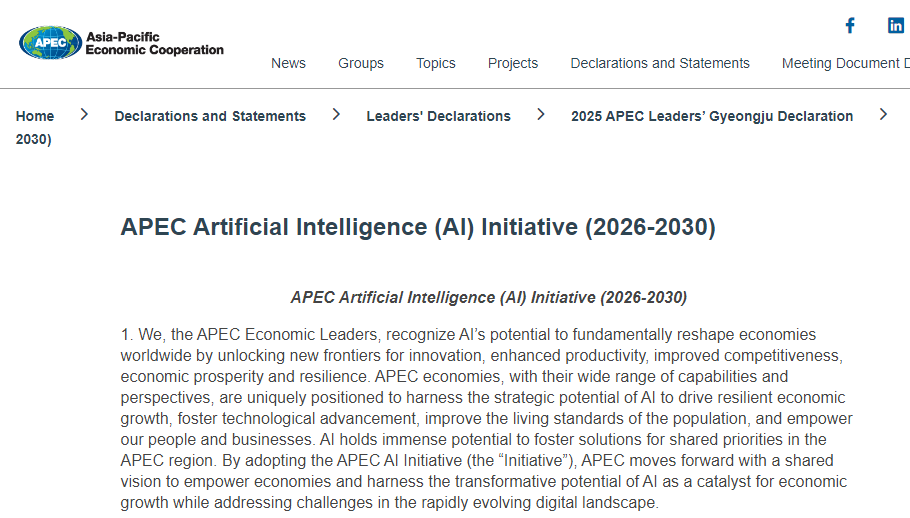 《2025年亚太经合组织领导人庆州宣言》明确指出,人工智能具备从根本上重塑全球经济格局的潜力,能够开辟创新发展路径、提升全要素生产率、增强国际竞争力,进而推动经济繁荣并增强系统韧性。为此,各方共同发布《亚太经合组织人工智能倡议(2026—2030)》,将其作为APEC框架下推进人工智能系统性转型的关键举措,致力于通过区域协同合作全面提升各层级人工智能能力,构建支撑韧性发展的AI基础设施与投资生态系统。宣言进一步呼吁各方持续加强在劳动力适配、教育体系重构及能力建设政策方面的协调,采取以人为本、平衡包容的治理路径,全面提升人工智能在应用过程中的安全性、可及性、可信度与可靠性,确保其发展成果惠及所有群体。同时,鼓励各经济体探索多样化协作机制,推动人工智能转型实现广泛覆盖与深度参与,为构建技术红利共享、AI赋能社会福祉的包容性数字未来奠定坚实基础。
