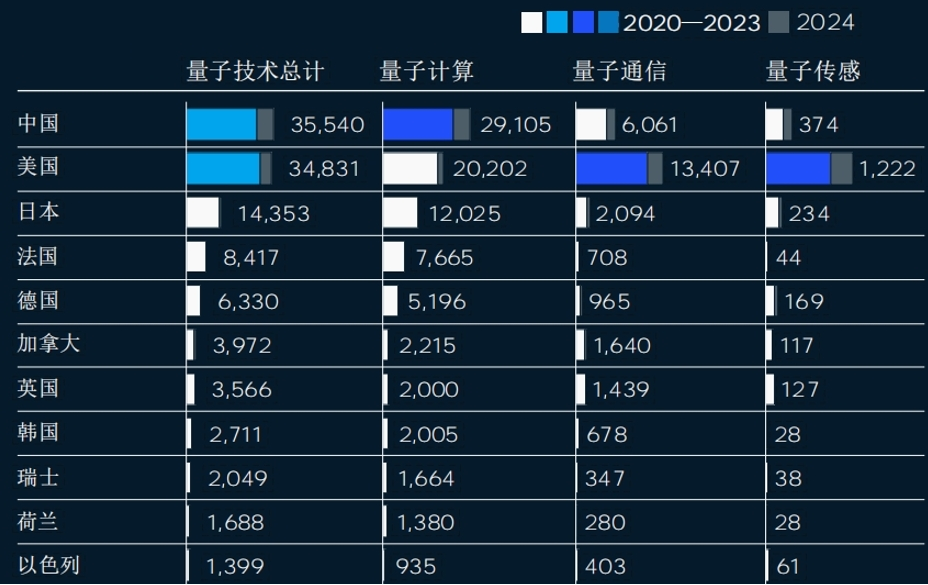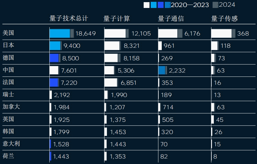 / / 全球量子技术专利授权美国最多,量子专利申请和相关出版物中国最多 在量子技术专利授予方面,2000—2024年间美国获得的授权最多,占全球总量的27%,其后依次是日本、德国、中国和法国(详见图4)。单从2024年度看,全球量子技术专利授权同比增长13%。其中,美国在新增授权中处于领先地位,其在量子通信领域的增长最快。在量子技术专利申请方面,中国提交的申请最多,占全球总量的28%,其后依次是美国、日本、法国和德国。其中,中国在量子计算领域的申请最多,美国在量子通信和量子传感领域的申请最多(详见图5)。 图4 2000—2024年全球量子技术专利授权前十国家 图5 2000—2024年全球量子技术专利申请前十国家