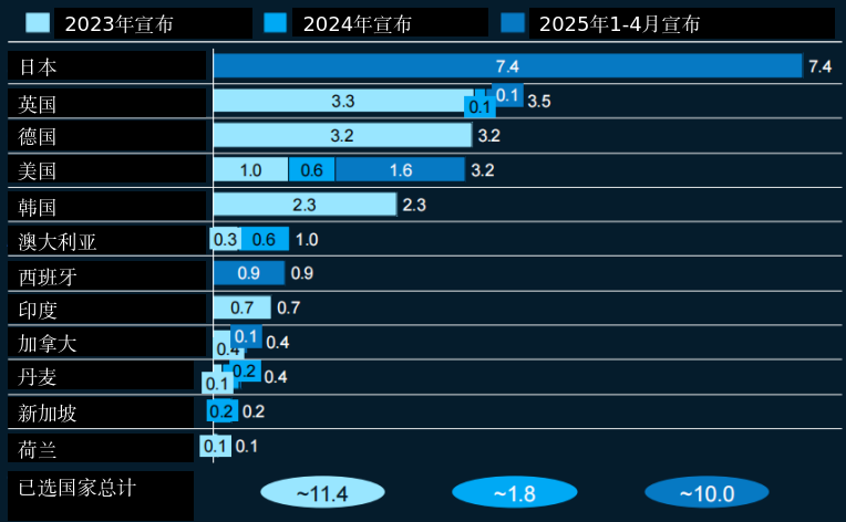 / / 全球量子技术领域公共和私营部门投资显著增加 截至2025年4月,全球公共部门宣布的量子技术领域投资已达540亿美元。其中,中国153亿美元位居榜首,日本92亿美元排名第二,美国60亿美元排名第三,其后依次是德国52亿美元、英国46亿美元、韩国24亿美元、法国22亿美元、印度17亿美元。另外,2024年新增公共投资18亿美元,美国(6亿美元)和澳大利亚(6亿美元)增幅最大;2025年1月至4月新增公共投资达到100亿美元,日本(74亿美元)、美国(16亿美元)和西班牙(9亿美元)排名前三(详见图2)。 图2 2023年1月至2025年4月各国新增量子技术公共投资 (单位:十亿美元)