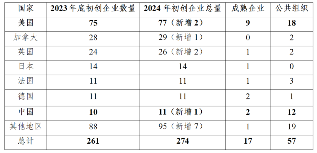 / / 全球量子技术领域初创企业增势良好,集群化发展趋势显现 2024年,全球量子技术领域初创企业数量较2023年有较大增长,由13家增加至19家,其中欧盟(8家)和亚洲(5家)最多。新增初创企业大多集中在设备和组件(新增5家)以及应用软件(新增6家)领域。同时,量子领域初创企业历史总量达到近400家(详见图6)。其中,量子计算领域的初创企业最多,共274家。从量子计算领域初创企业的国别分布看,美国共77家,占比高达28%,其后依次是加拿大、英国、日本、法国、德国和中国。从量子计算领域初创企业的的价值链分布看,应用软件领域的初创企业最多,共92家,其后依次是硬件(47家)、系统软件(46家)、设备和组件(44家)和服务领域(42家)(详见图6)。麦肯锡认为,未来5~10年量子领域主要增加值将由设备和组件领域转向应用软件和服务领域。 图6 2001—2024年全球量子技术领域初创企业设立情况