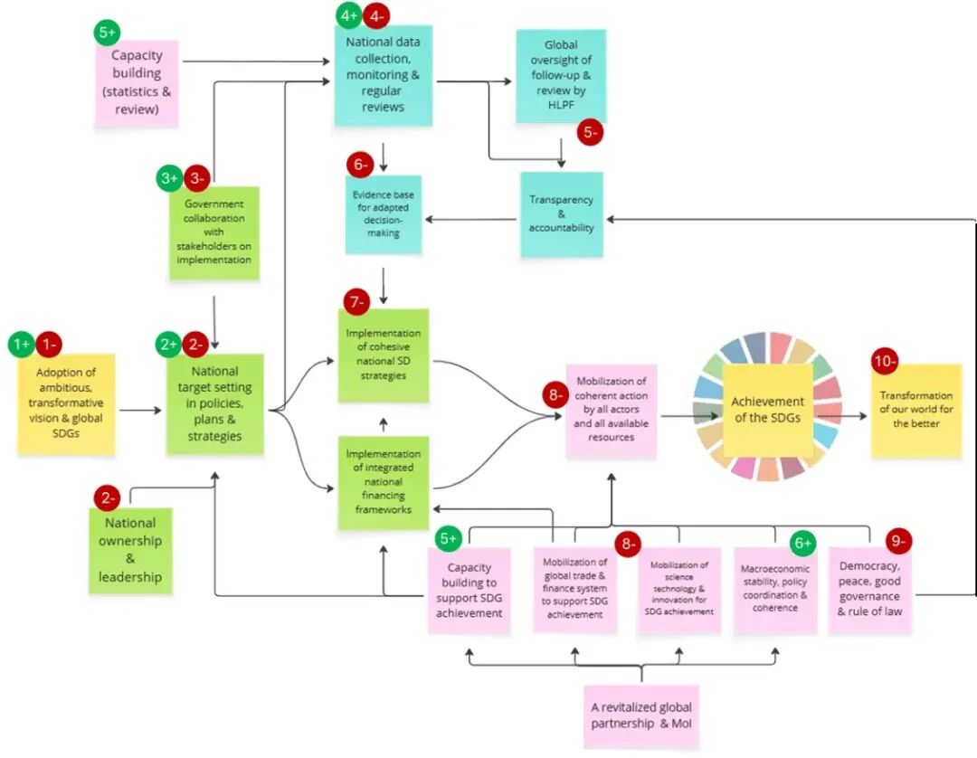 图 1. 隐含的“变革理论”。 关于2030年议程中设想的变革过程的假设框架,涉及以下四个方面:1. 全球目标设定和转型(黄色);2. 行动者和本地化(绿色);3. 审查(蓝色);以及4. 执行手段(粉色)。绿色数字(带“+”符号)表示成功之处,红色数字(带“-”符号)表示不足之处。