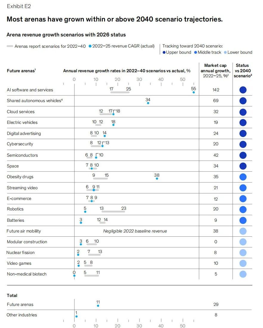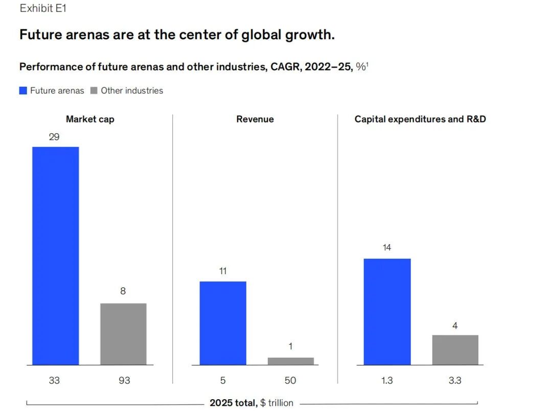 2022—2025年是新赛道的爆发期,核心增长数据呈现“三极领先”特征:其一,市值复合年增长率(CAGR)达29%,接近传统行业的4倍;其二,收入CAGR达11%,而传统行业收入整体持平;其三,资本支出与研发投入CAGR达14%,远超传统行业的4%。仅三年间,18个新赛道合计新增市值约18万亿美元。