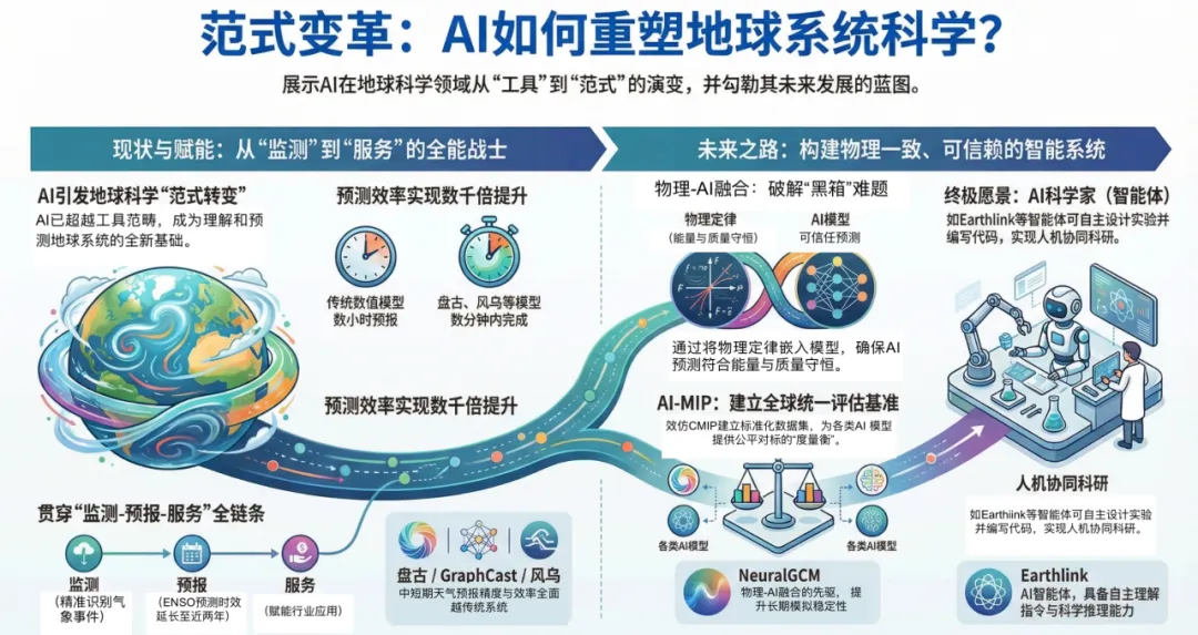 这篇由国际重量级团队完成的综述,不仅是对过去几年AI地球科学爆炸性发展的系统性总结,更是为整个领域的未来发展绘制了权威路线图。它标志着该领域从追求“预测性能”的初级阶段,迈入了构建“物理一致、值得信赖、可业务化”的下一代地球系统智能科学的新纪元。
