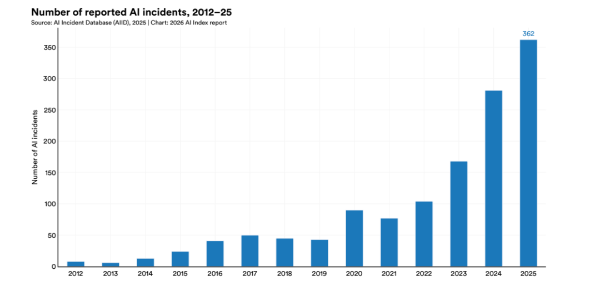 报告揭示了人工智能责任治理与技术发展之间日益扩大的鸿沟。2025年,被记录在案的人工智能安全事件数量从上一年的233起跃升至362起,涵盖深度伪造、隐私泄露、算法偏见等多个领域,增幅超过55%。主流大语言模型的幻觉率(Hallucination Rate)仍高达22%至94%,远未达到高风险场景所要求的可信赖标准。