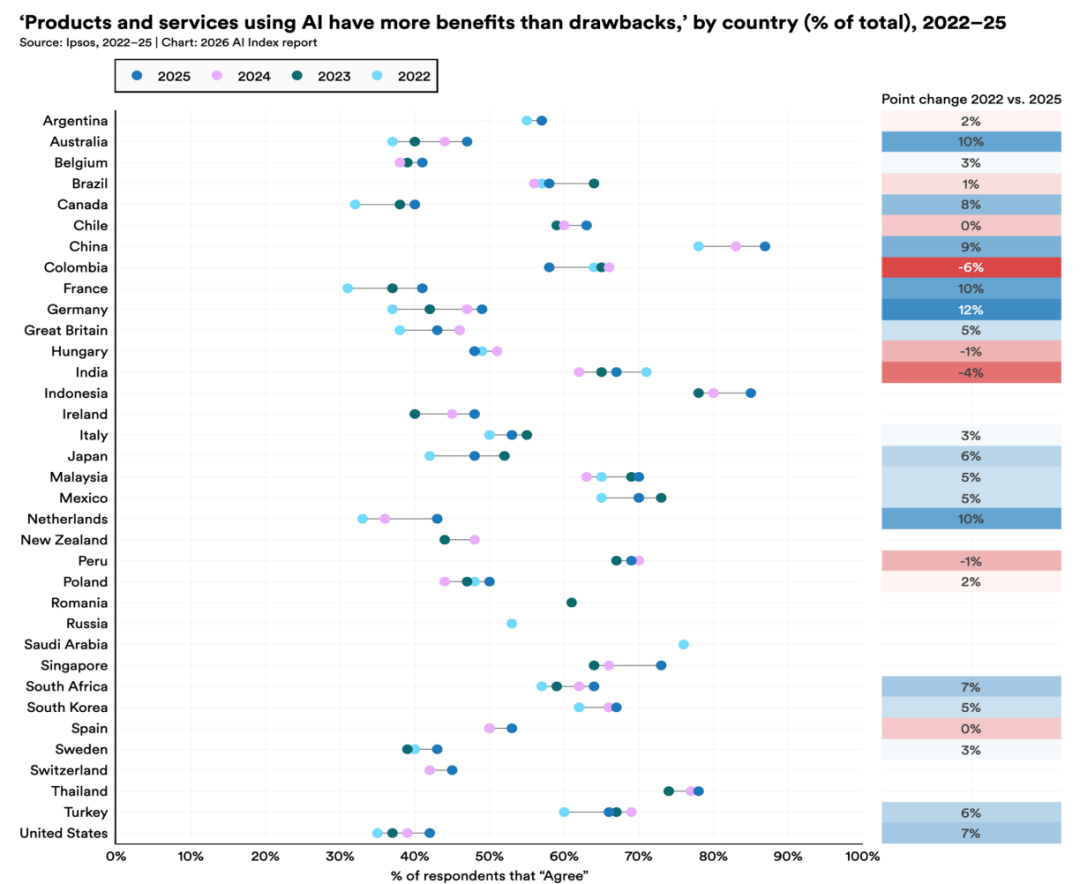全球公众对人工智能的态度正在走向复杂的分化。2025年Ipsos对30个国家的调查显示,59%的受访者认为人工智能产品利大于弊(较2024年上升4个百分点),但同时有52%的人表示人工智能让他们感到紧张,乐观与不安同步增长。东南亚国家持续表现出最高的人工智能乐观度,马来西亚、泰国、印度尼西亚和新加坡超过80%的受访者预期人工智能将在未来三至五年深刻改变自己的生活;印度则出现了全球最大幅度的焦虑上升。在新兴经济体中,人工智能在职场中的使用率反而高于发达国家,印度、中国、尼日利亚、阿联酋和沙特阿拉伯的员工定期使用人工智能的比例超过80%。