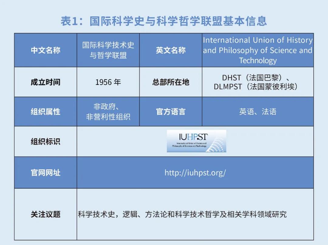 国际科学技术史与哲学联盟(International Union of History and Philosophy of Science and Technology,IUHPST)成立于1956年,是国际科学理事会(ISC)成员组织之一。IUHPST由两个分支组织组成:1947年成立的国际科学技术史分会(Division of History of Science and Technology (DHST))和1949年成立的国际科学技术哲学分会(Division of Logic, Methodology and Philosophy of Science and Technology (DLMPST))。两个分支组织还同时是国际哲学与人文科学理事会(CIPSH)的成员。