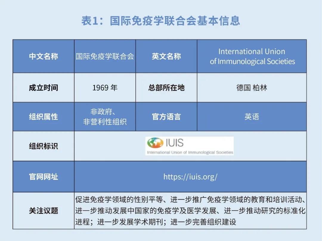 国际免疫学联合会(International Union of Immunological Societies,以下简称为“IUIS”)是一个国际性的非政府和非营利性科学组织,于1969年创建于比利时布鲁日。作为国际科学理事会(ISC)的成员组织,IUIS目前拥有81个正式成员,分别属于欧洲、拉丁美洲、非洲、亚太地区联盟和北美地区。IUIS的宗旨是组织免疫学方面的国际合作,促进免疫学各个分支机构与相关学科之间的交流;在代表免疫学利益的各学会之间,在每个科学独立的领域内鼓励合作;为免疫学的发展做出贡献。此外,IUIS与世界卫生组织(WHO)、国际实验动物科学理事会(ICLAS)等国际组织建立了广泛的联系,在多个领域开展合作。