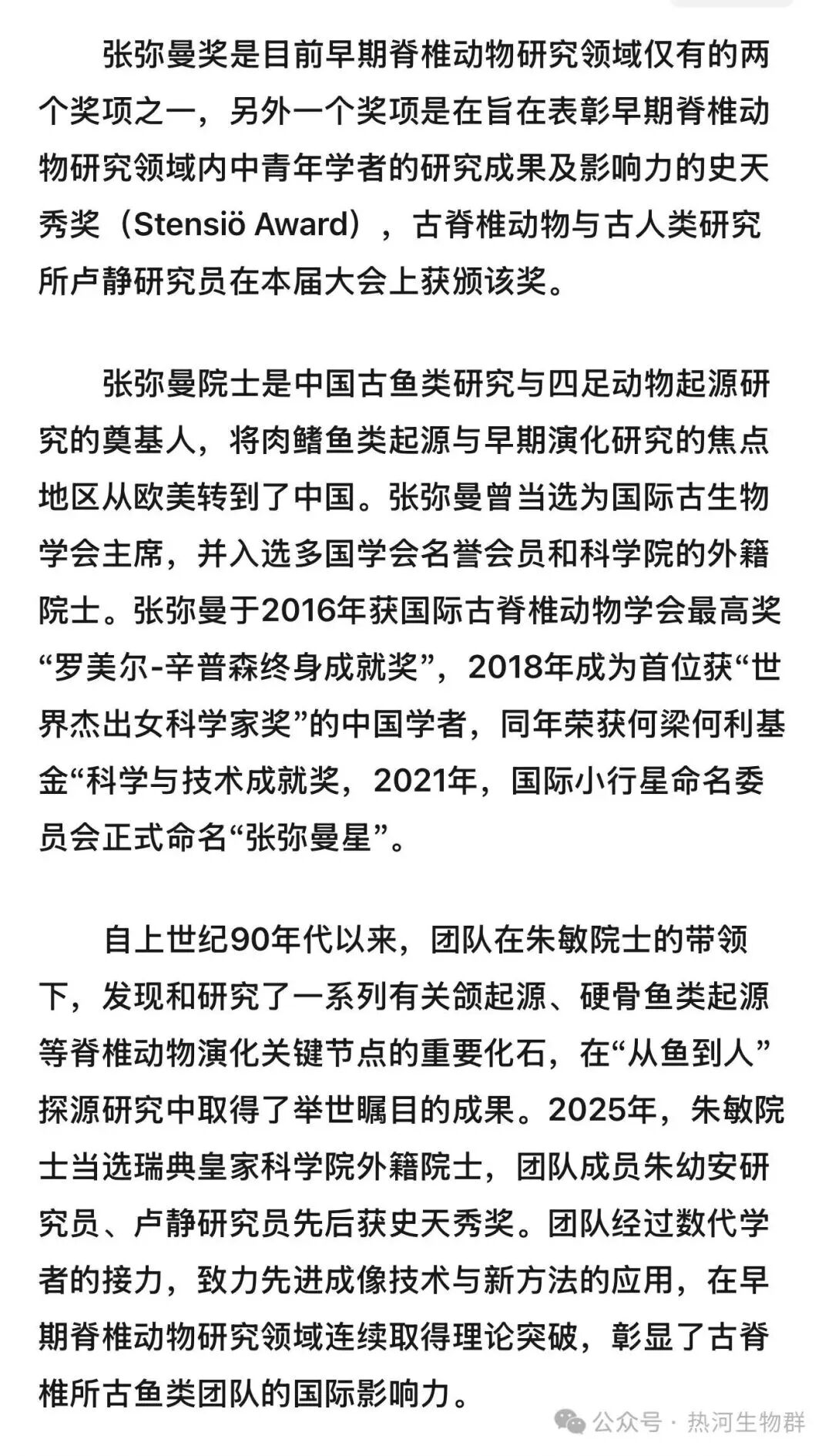 近日,在摩洛哥举行的第18届早期脊椎动物国际学术研讨会上,经国际早期低等脊椎动物学会组委会提议和表决,新设立了以张弥曼院士命名的张弥曼奖(Meemann Chang Award),旨在表彰领域内的优秀青年研究者。
