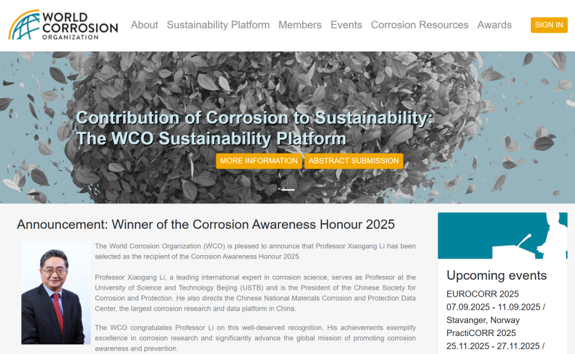 近日,中国腐蚀与防护学会理事长、北京科技大学教授李晓刚荣获联合国世界腐蚀组织(WCO)颁发的2025年“腐蚀成就奖”。“腐蚀成就奖”于2021年首次设立,由世界腐蚀组织、欧洲腐蚀联合会和中国腐蚀与防护学会联合发起,旨在授予具有重大影响力,显著提高了政府、科技界、工业界和公众对腐蚀及防腐重要性的认知,并在腐蚀控制领域做出杰出贡献的科学家。该奖项由世界腐蚀组织、欧洲腐蚀联合会及中国腐蚀与防护学会的委员等组成的国际评审委员会评议,不接受个人申报。经多轮投票和评议,委员会一致推选李晓刚教授为2025年度“腐蚀成就奖”获奖者。