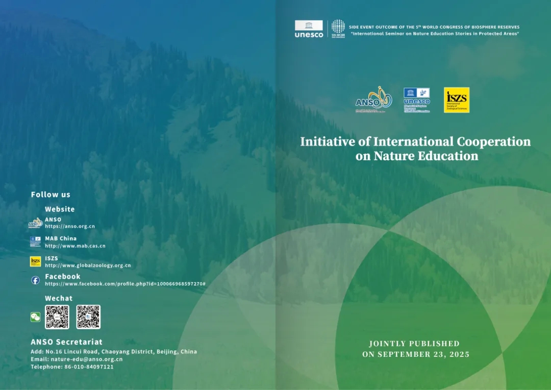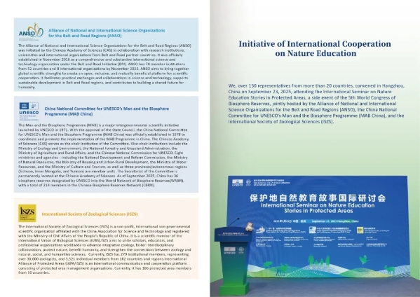 On September 23, 2025, the International Seminar on Nature Education Stories in Protected Areas, a side event of the Fifth World Congress of Biosphere Reserves was held in Hangzhou, China. The Initiative of International Cooperation on Nature Education was joint released by the Alliance of National and International Science Organizations for the Belt and Road Regions (ANSO), the China National Committee for UNESCO’s Man and the Biosphere Programme (MAB China), and the International Society of Zoological Sciences (ISZS). More than 150 representatives from over 20 countries—including Cameroon, Chile, Indonesia, Kenya, Malaysia, Nepal, Russia, Senegal, Kazakhstan, and Austria—as well as international organizations, attended the seminar and supported the initiative. This initiative aims to build consensus and highlight the significant role of international cooperation on nature education. It seeks to foster harmony between humans and nature by integrating nature education into protected area strategies and evaluation system, sharing local success practices worldwide, and empowering nature education through science and technology. Together, these actions will transform international cooperation in nature education into a powerful engine for ecological conservation innovation, advancing the vision of UNESCO's Man and the Biosphere Programme, and a shared future for all life on Earth.