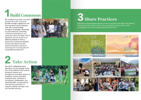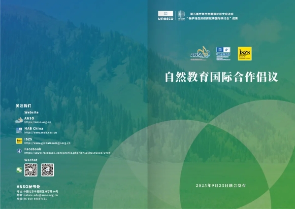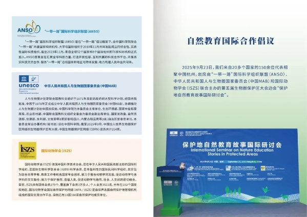 2025年9月23日,第五届世界生物圈保护区大会边会“保护地自然教育故事国际研讨会”在杭州举行。会上,“一带一路”国际科学组织联盟(ANSO)、中华人民共和国人与生物圈国家委员会(中国MAB)及国际动物学会(ISZS)联合发布了《自然教育国际合作倡议》,得到来自喀麦隆、智利、印度尼西亚、肯尼亚、马来西亚、尼泊尔、俄罗斯、塞内加尔、哈萨克斯坦、奥地利等20余个国家和国际组织的150多名代表的积极响应。