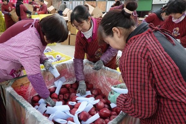 在甘肃省天水市麦积区花牛镇新民苹果种植专业合作社,工作人员将花牛苹果装箱(2019年11月3日摄)。新华社发(耿馨宁 摄)